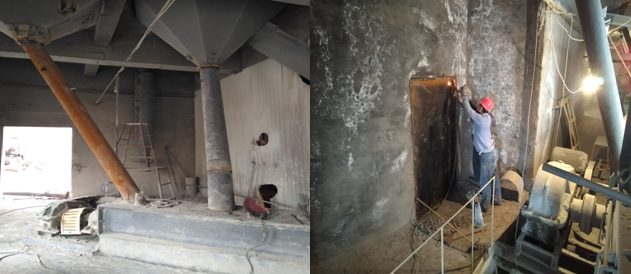3#包機(jī)塵降回料鉸刀拆除和除塵管改造,下導(dǎo)倉處正在密封一個門口