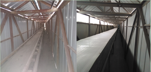 砂巖皮帶技改安裝回料毛刷 ;旋窯車間石粉倉下正在安裝皮帶防塵罩