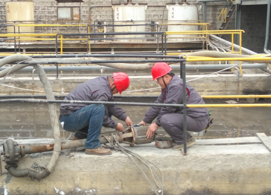 電氣運(yùn)行員工楊磊、王光彬正在搶修泥漿泵