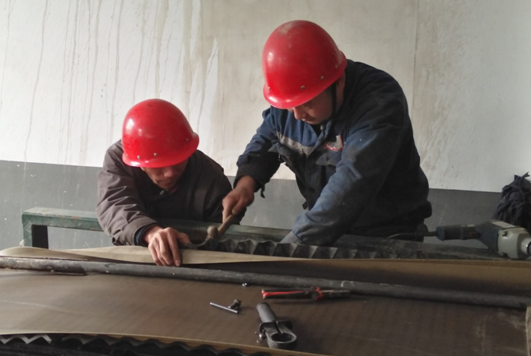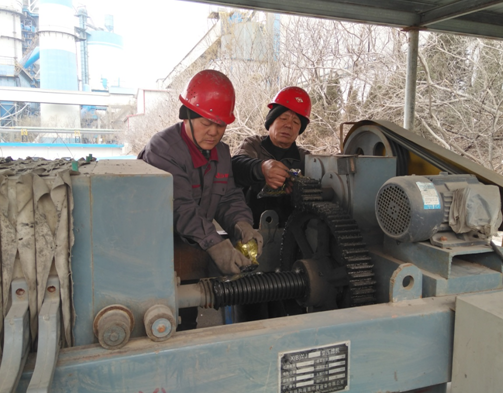 維修工劉法勝、張?jiān)稣跈z修真空皮帶機(jī)