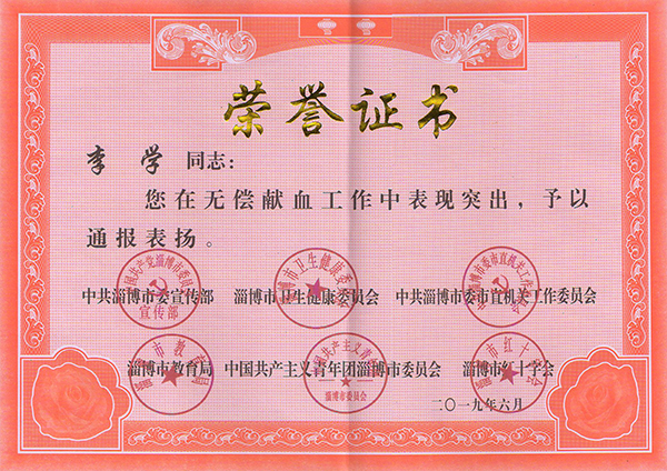 祝賀集團公司和李學董事長榮獲市無償獻血榮譽