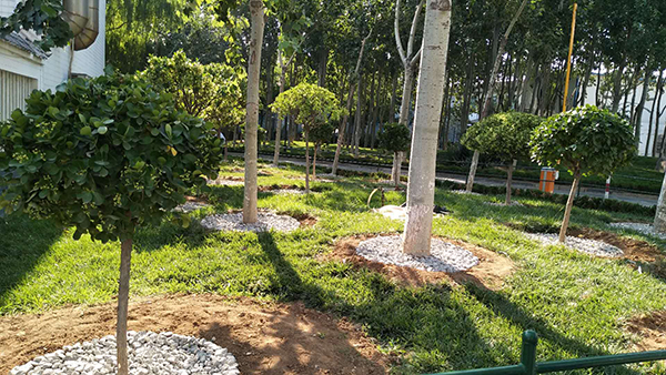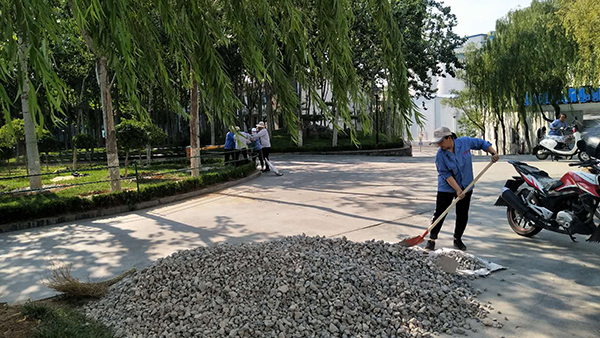 隨著高溫酷暑季節(jié)到來(lái),為保持綠化區(qū)樹穴澆灌水不流失,6月23日,物資部經(jīng)理張娟聯(lián)系供料車間運(yùn)來(lái)石子和土,物資部眾姐妹紛紛拿起工具,頂著烈日行動(dòng)起來(lái),大家分工合作,卸車、運(yùn)輸,為每個(gè)樹穴填土、鋪石子,歷經(jīng)一天的時(shí)間,為綠化帶的樹木穿上了一層美麗的嫁衣。