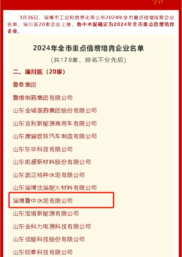 【榮譽(yù)】魯中水泥入選淄博市重點(diǎn)倍增培育企業(yè)