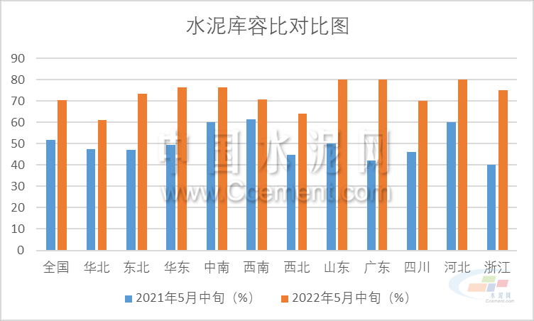 從中國水泥網(wǎng)·水泥大數(shù)據(jù)統(tǒng)計情況看,5月20日全國水泥庫容比攀升至70.27%,分區(qū)域看,除了華北和西北外,剩余區(qū)域水泥庫容比均在70%以上,華東和中南甚至超過75%。從重點省份來看,情況更加不樂觀。在筆者選取的山東、廣東、四川等五個水泥大省中,山東、廣東和河北水泥庫容比超過80%,而去年同期這些省份水泥庫容比均在60%及以下,廣東只有42%。