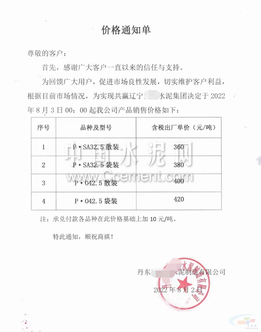 7月30日-8月2日江蘇淮安、連云港等地一些主要廠家開始通知上調(diào)水泥價格10-20元/噸左右,據(jù)悉部分企業(yè)將于4日繼續(xù)跟進上調(diào)10元/噸。