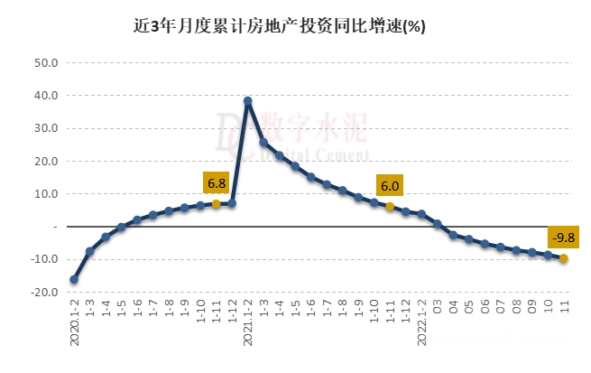 1-11月,全國(guó)房地產(chǎn)開(kāi)發(fā)投資12.39萬(wàn)億元,同比下降9.8%,降幅較1-10月擴(kuò)大1個(gè)百分點(diǎn),去年同期為增長(zhǎng)6%。其中,住宅投資9.4萬(wàn)億元,同比下降9.2%。