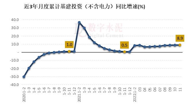 1-11月,全國(guó)基礎(chǔ)設(shè)施投資(不含電力)同比增長(zhǎng)8.9%,增速較1-10月上升0.2個(gè)百分點(diǎn),高于去年同期8.4個(gè)百分點(diǎn)。其中,水利管理業(yè)投資同比增長(zhǎng)14.1%,道路運(yùn)輸業(yè)投資增長(zhǎng)2.3%,鐵路運(yùn)輸業(yè)投資增長(zhǎng)2.1%。