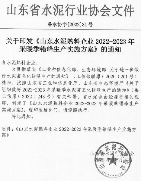 11月8日,山東省工業(yè)和信息化廳,生態(tài)環(huán)境廳發(fā)布《山東省工業(yè)和信息化廳山東省生態(tài)環(huán)境廳關(guān)于組織做好2022-2023年采暖季水泥常態(tài)化錯峰生產(chǎn)的通知》(魯工信原[2022]243號),《通知》中要求全省水泥熟料企業(yè)的所有熟料生產(chǎn)線(含特種水泥熟料生產(chǎn)線)在2022年11月15日0:00-2023年3月15日24:00進(jìn)行錯峰生產(chǎn)。