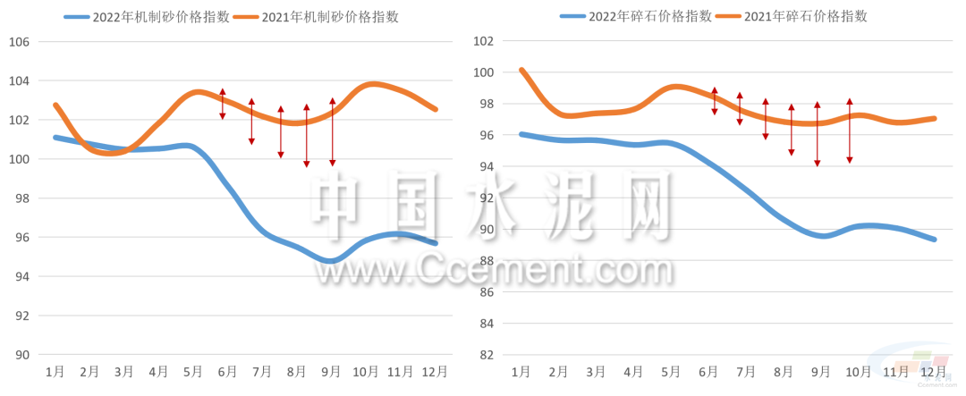 截至12月底,全國碎石價格指數報收88.07點,同比下降9.07%。全國機制砂價格指數報收94.38點,同比下降7.49%。從機制砂均價來看,2022年砂石價格整體呈弱勢下跌趨勢,二季度中下旬后價格行情明顯走弱,4-10月的月均機制砂價格指數同比跌幅持續(xù)擴大,四季度后價格反彈力度并不大。
