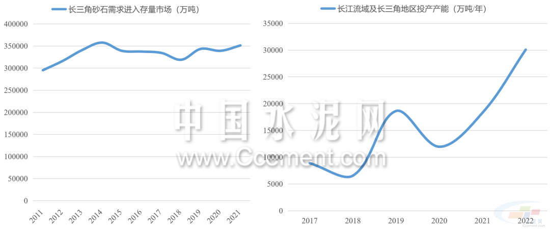 近年來長江中下游城市的砂石骨料需求趨于平穩(wěn),2015年后江浙滬皖地區(qū)的砂石骨料需求量圍繞34億噸均線上下震蕩,長三角地區(qū)需求進入存量市場。但是,2017年至2022年,除青海西藏外,長江流域省市(含浙江)每年投放的砂石骨料產能翻了三倍。長江流域面臨供給過剩危機,長期價格或進入下行區(qū)間。