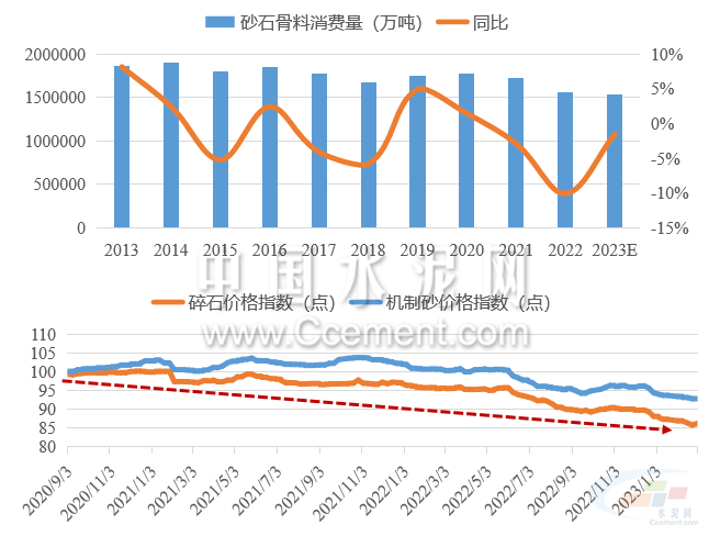 預計2023年需求偏穩(wěn)運行,二季度后需求或有所反彈。根據水泥、混凝土的需求預期,預計2023年全國砂石骨料需求同比偏穩(wěn)運行,或有小幅下滑。在供需反向變動的預期下,長期價格進入下行區(qū)間,預計2023年砂石價格中樞仍將小幅下移。