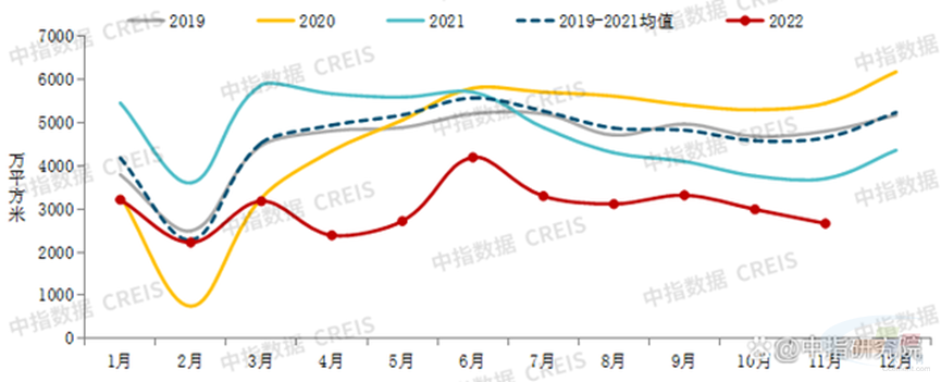 2022年1-11月,重點100城新建商品住宅成交面積同比降幅近四成,絕對規(guī)模為2015年以來同期最低水平。據(jù)初步統(tǒng)計,2022年1-11月,100個代表城市新建商品住宅月均成交面積約3027萬平方米,同比下降36.8%。