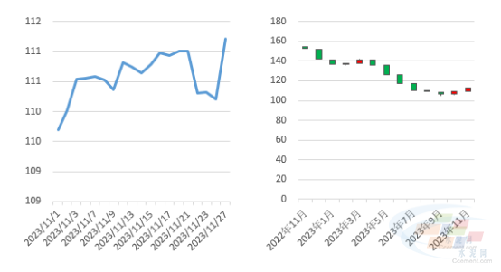 圖為2023年11月全國水泥價格指數(shù)CEMPI、水泥價格指數(shù)(CEMPI)K線圖