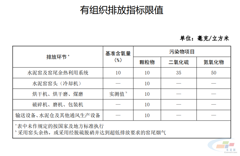 征求意見稿提到了有組織排放指標(biāo)要求,在基準(zhǔn)含氧量10%的條件下,水泥窯及窯尾余熱利用系統(tǒng)煙氣顆粒物、二氧化硫、氮氧化物排放濃度小時均值分別不高于10、35、50mg/m3。達(dá)到超低排放的水泥企業(yè)每月生產(chǎn)時間至少95%以上時段小時均值排放濃度滿足上述要求。