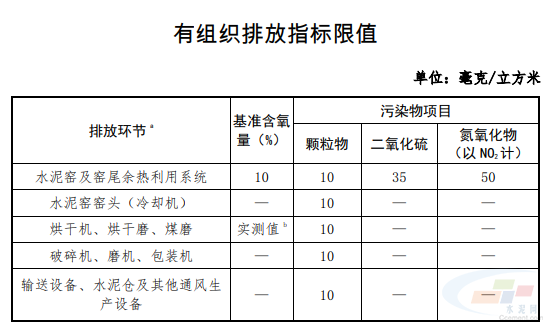 (一)有組織排放控制指標(biāo)。在基準(zhǔn)含氧量 10%的條件下,水泥 窯及窯尾余熱利用系統(tǒng)廢氣顆粒物、二氧化硫、氮氧化物排放濃度小時均值分別不高于 10mg/m3、35mg/m3、50mg/m3。其他有組織排放,氨等表中未作規(guī)定的按國家或地方標(biāo)準(zhǔn)執(zhí)行。達(dá)到超低排放的水泥企業(yè)每月生產(chǎn)時間至少 95%以上時段排放濃 度小時均值滿足上述要求。