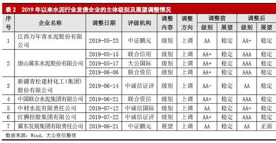 2019年以來,水泥行業(yè)內(nèi)發(fā)債企業(yè)的級別遷移均為主體級別或展望上調(diào),涉及主體7家。具體來看,級別上調(diào)的企業(yè)6家,除1家由AA-調(diào)整為AA外,其余5家調(diào)整后級別均在AA+以上;展望上調(diào)的企業(yè)1家,評級展望由穩(wěn)定調(diào)整為正面。級別或展望上調(diào)的理由主要包括區(qū)域性政策利好于行業(yè)發(fā)展,收并購促進(jìn)資源整合,企業(yè)經(jīng)營業(yè)績顯著提升,資金流動性顯著改善等。