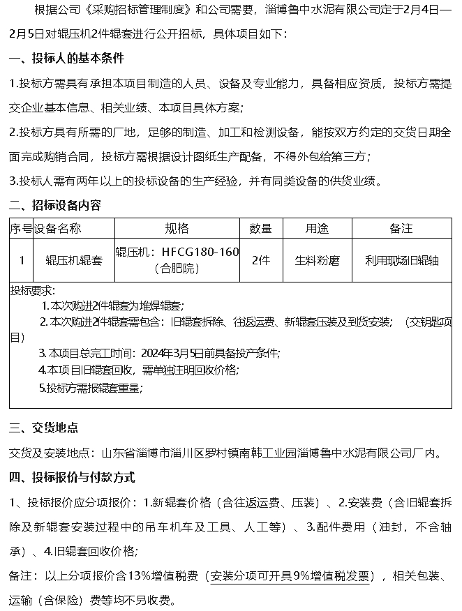 【招標(biāo)公告】魯中水泥