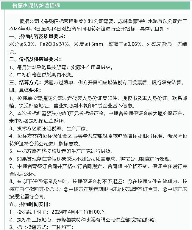 【招標(biāo)公告】魯中水泥煙煤、魯蒙水泥轉(zhuǎn)爐渣招標(biāo)