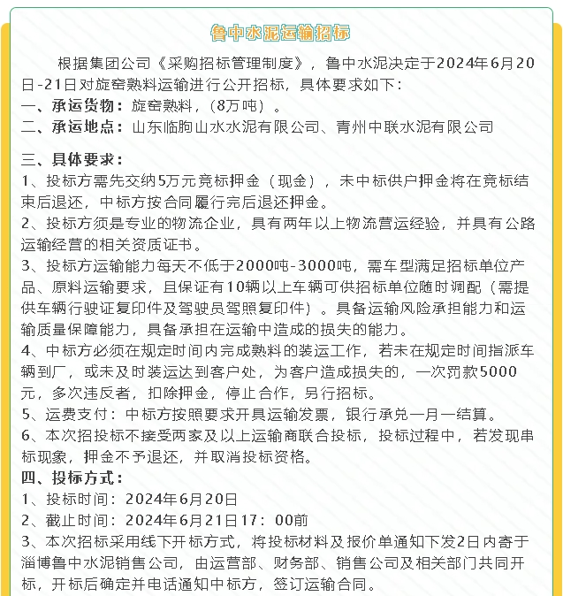 【招標(biāo)公告】魯中水泥運(yùn)輸、水渣招標(biāo)