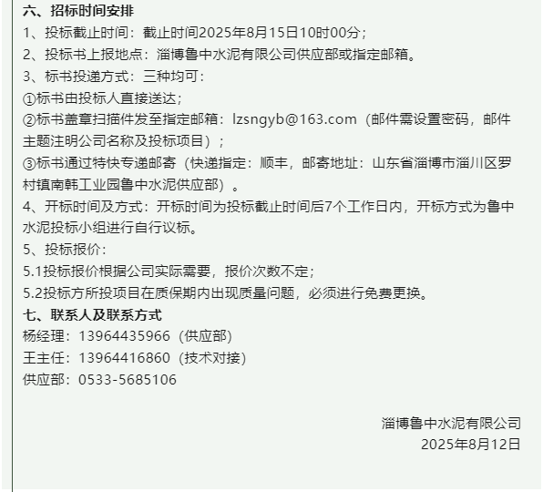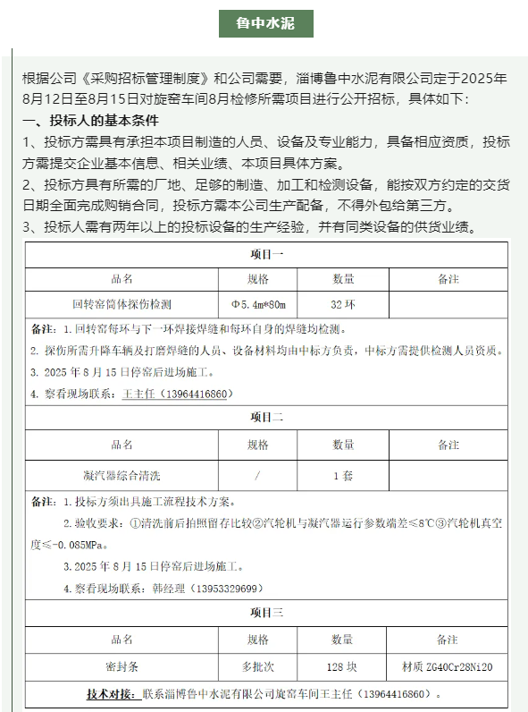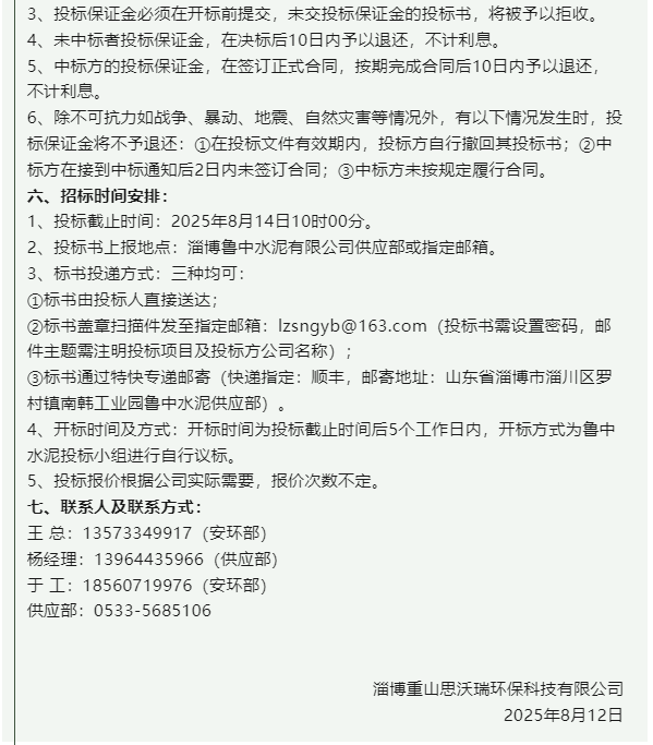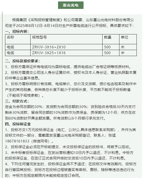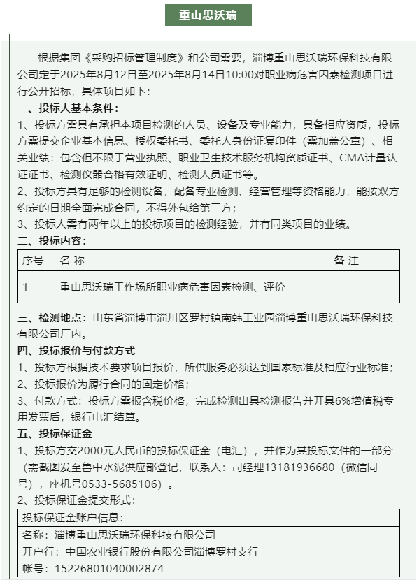【招標公告】魯中水泥、重山思沃瑞、重山光電