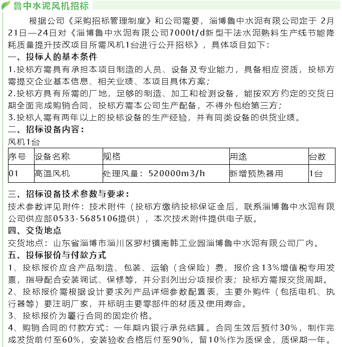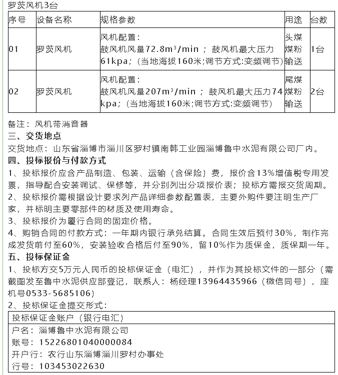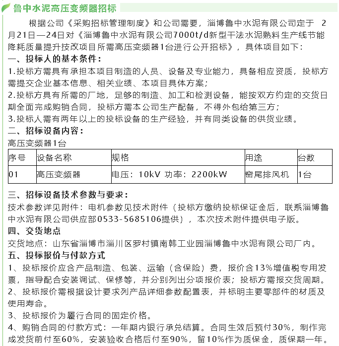【招標(biāo)公告】魯中水泥羅茨風(fēng)機、高壓變頻器、提升機、風(fēng)機招標(biāo)