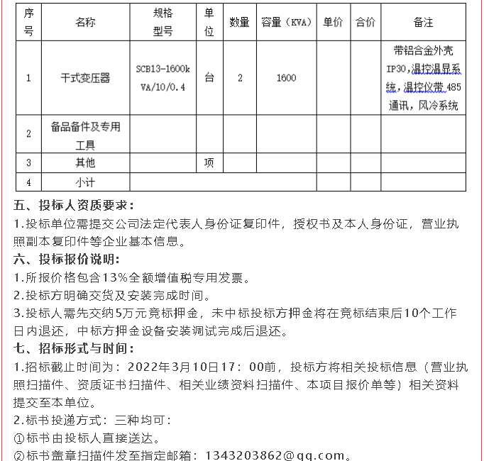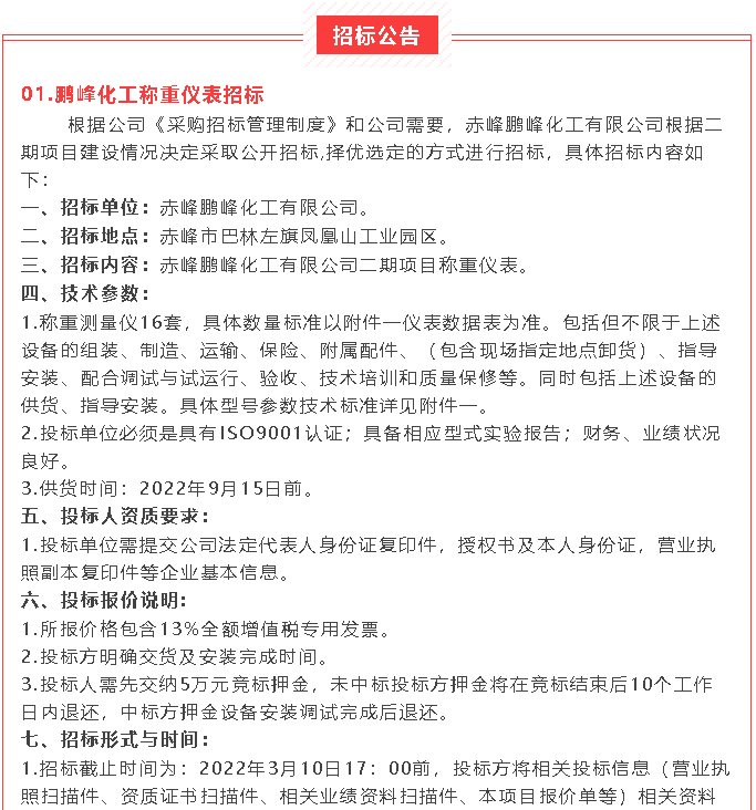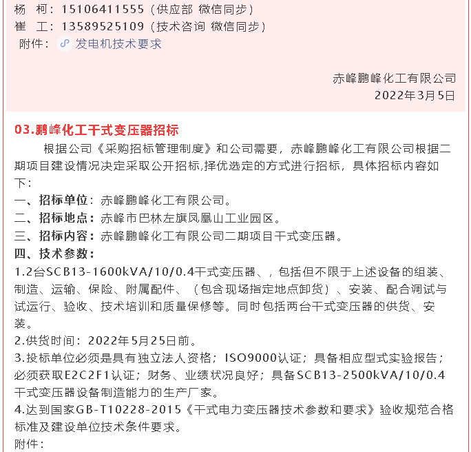 【招標(biāo)公告】鵬峰化工稱(chēng)重儀表、柴油發(fā)電機(jī)、干式變壓器招標(biāo)