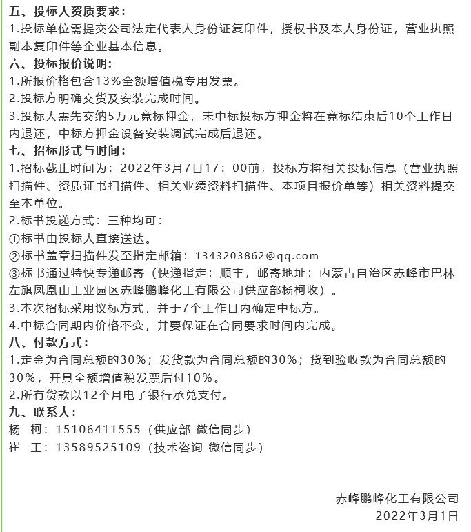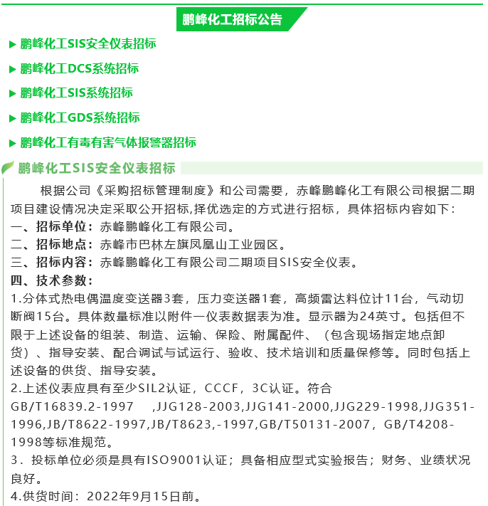 【招標(biāo)公告】 鵬峰化工SIS安全儀表、DCS系統(tǒng)、SIS系統(tǒng)、GDS系統(tǒng)、有毒有害氣體報(bào)警器招標(biāo)