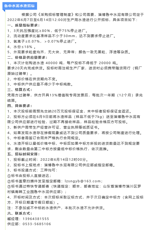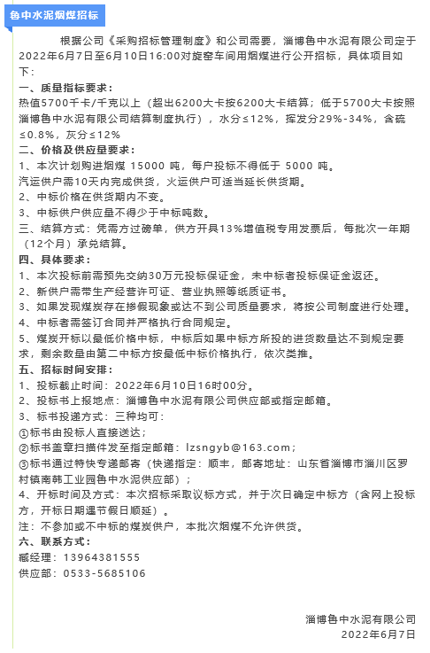 【招標(biāo)公告】魯中水泥水渣、煙煤招標(biāo)