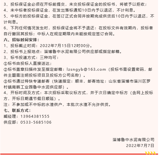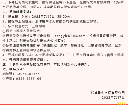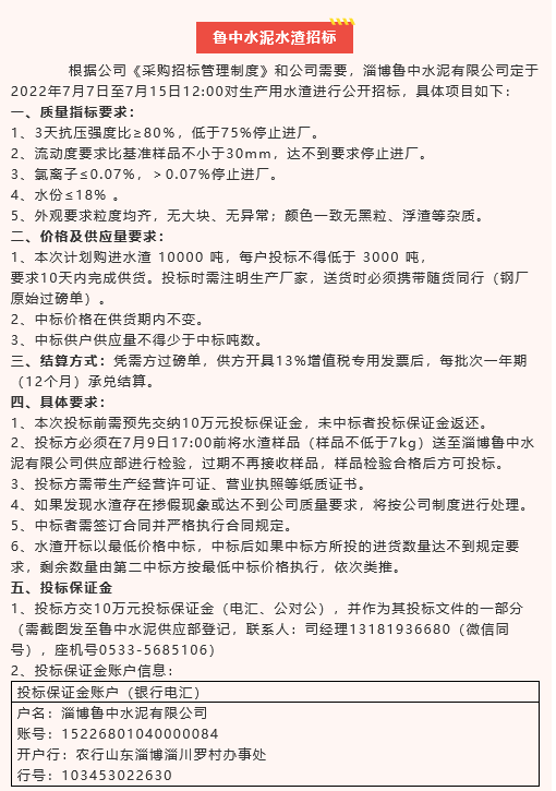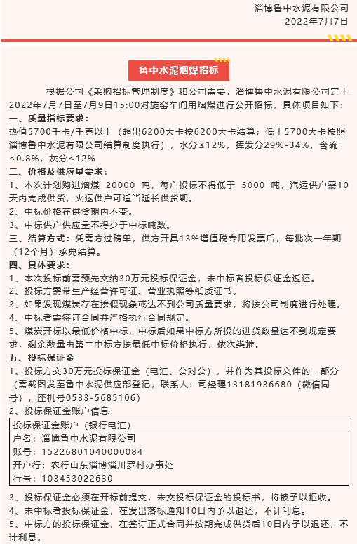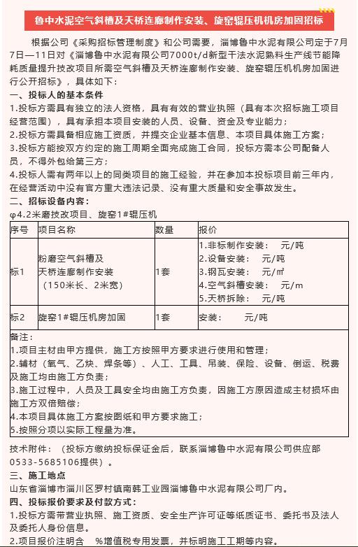 【招標公告】魯中水泥水渣、空氣斜槽及天橋連廊制作安裝、旋窯輥壓機機房加固、煙煤招標