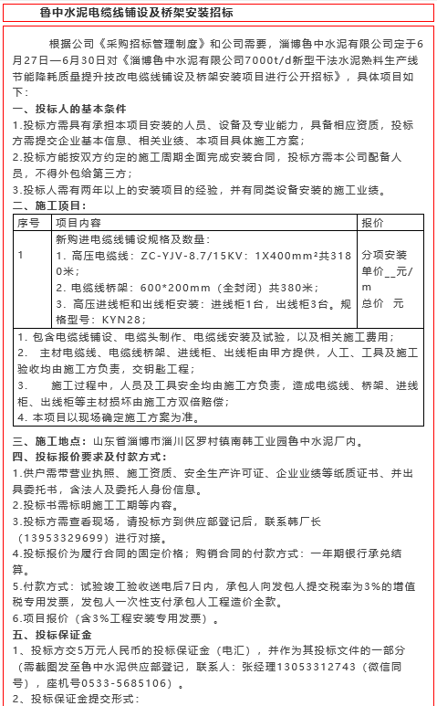 【招標(biāo)公告】魯中水泥電纜線鋪設(shè)及橋架安裝招標(biāo)、重山思沃瑞安防系統(tǒng)招標(biāo)?