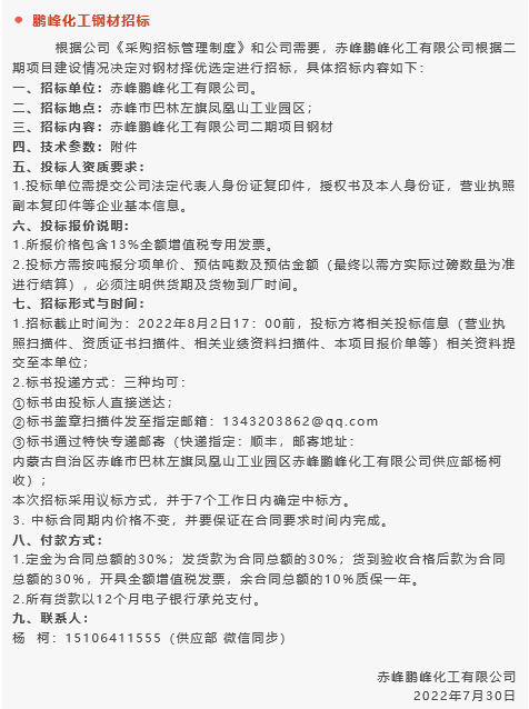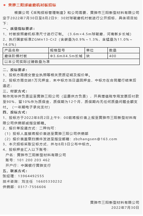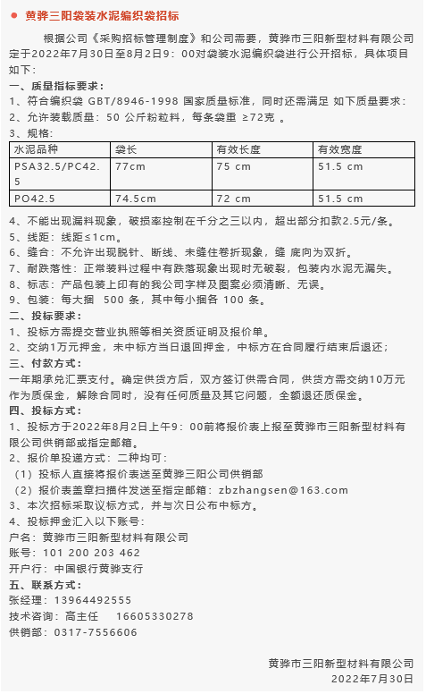 【招標公告】魯蒙水泥煙煤,黃驊三陽球破磨機襯板、袋裝水泥編織袋,鵬峰化工鋼材招標
