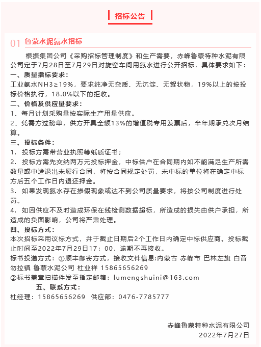 【招標公告】魯蒙水泥、鵬峰化工