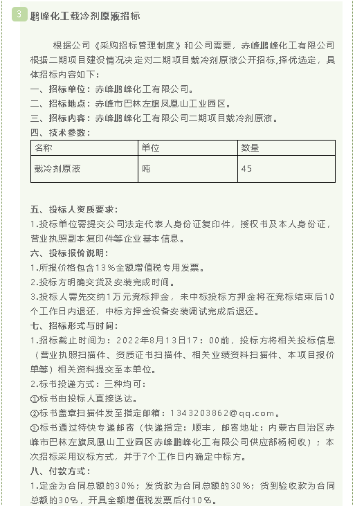 【招標(biāo)公告】鵬峰化工單梁起重機(jī)、導(dǎo)氣管、載冷劑原液招標(biāo)