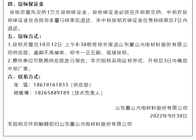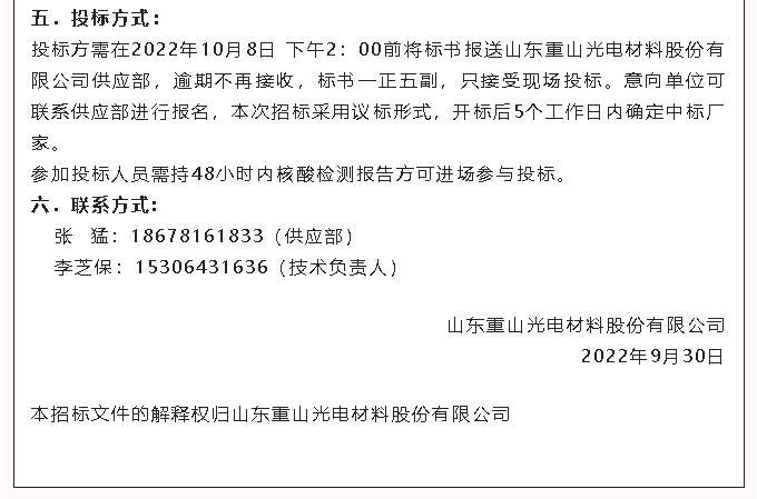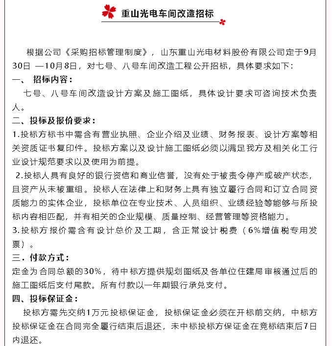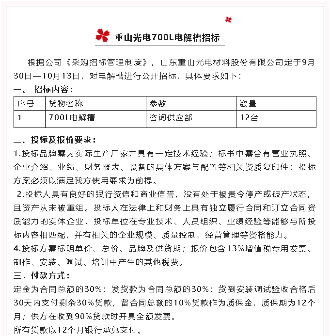 【招標(biāo)公告】重山光電700L電解槽、車間改造、冷凝器招標(biāo)