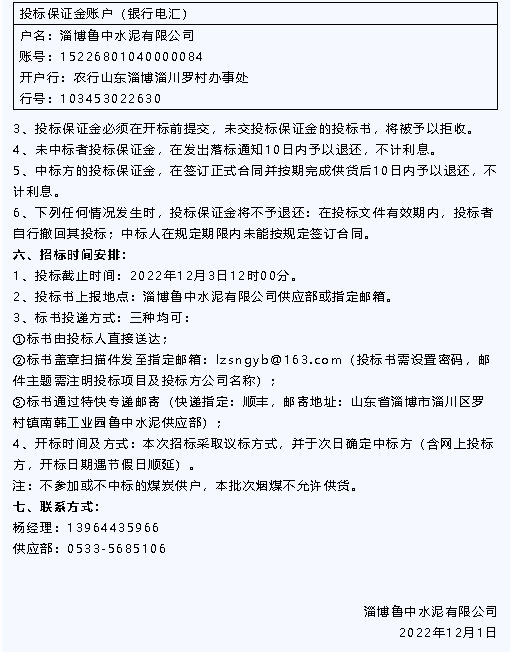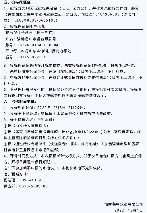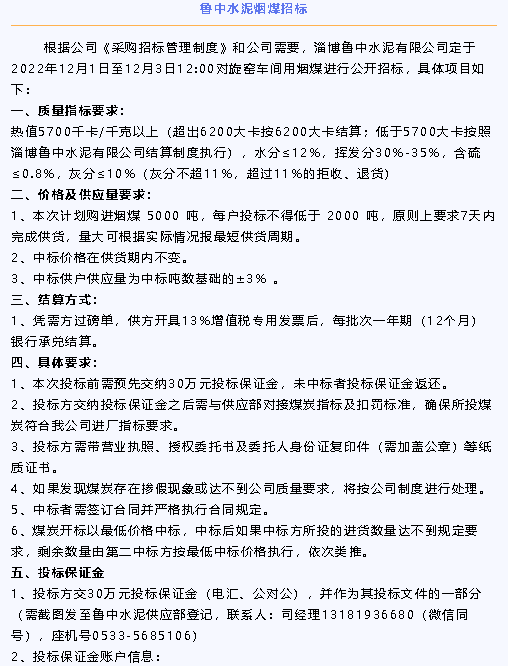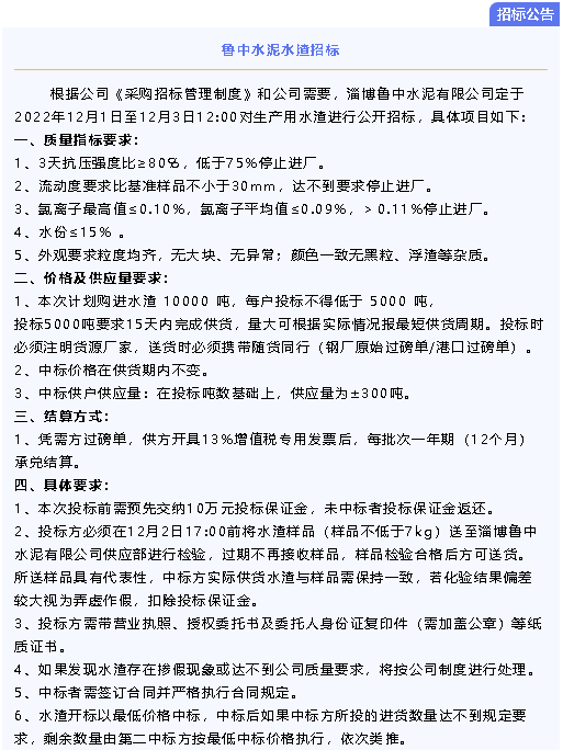 【招標(biāo)公告】魯中水泥水渣、煙煤招標(biāo)