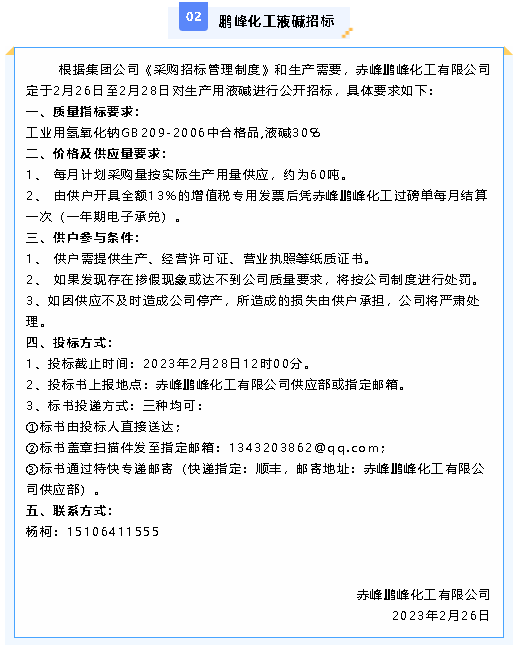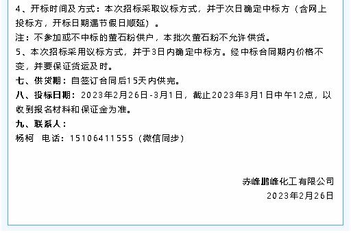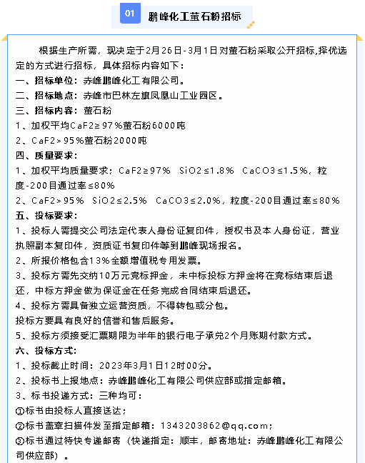 【招標公告】鵬峰化工螢石粉、液堿招標