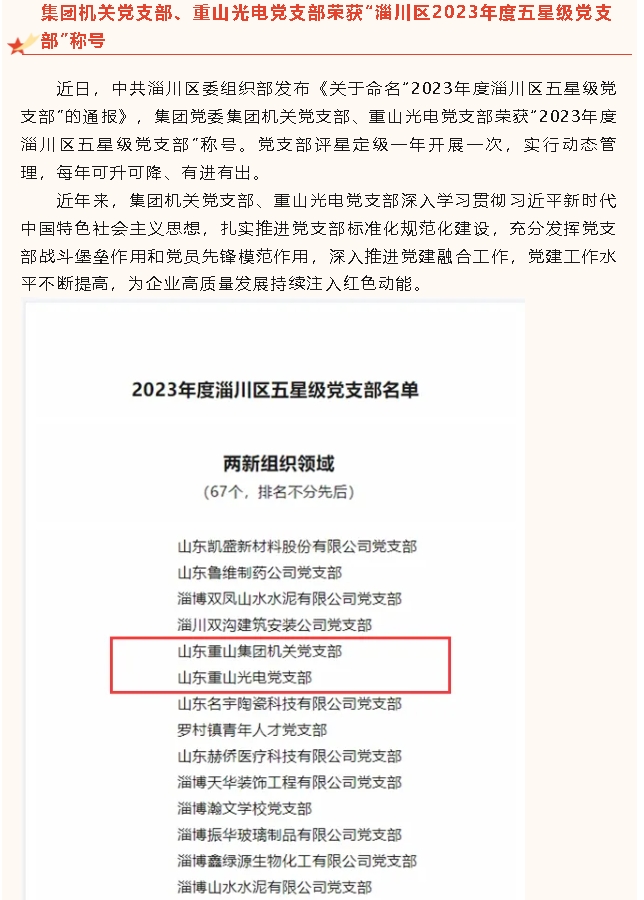 【黨建】集團(tuán)機(jī)關(guān)黨支部、重山光電黨支部榮獲“淄川區(qū)2023年度五星級(jí)黨支部”稱號(hào)