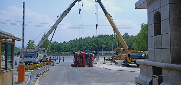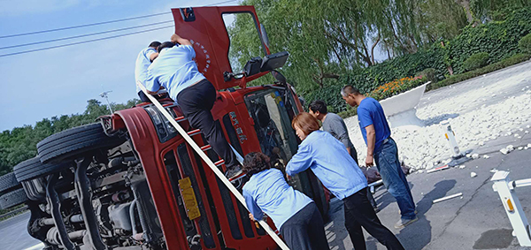 6月22日,正值大家正常工作的時(shí)間,一聲巨響打破了工作的寧?kù)o。102省道由東往西的一輛河北籍重型卡車為躲避突然掉頭的車輛向公司正門西側(cè)猛沖過(guò)來(lái),緊急的剎車讓車輛瞬間傾翻在地,滿載的數(shù)十噸石灰灑落一地。集團(tuán)總務(wù)處主任王宏得知消息立即向前查看詳情,側(cè)翻造成了駕駛室嚴(yán)重變形,貨車司機(jī)被困其中,無(wú)法動(dòng)彈,傷勢(shì)不明。安保隊(duì)員陳萬(wàn)鵬在第一時(shí)間撥打了120救助電話。怎樣把受傷人員從側(cè)翻變形的駕駛室中迅速救出來(lái)成了首先解決的難題。側(cè)翻的駕駛室目測(cè)有兩米高,需要搭梯才能進(jìn)入朝天的車門,時(shí)間不等人,早一分鐘救出傷員,他們的生命就少一份危險(xiǎn),安保人員用被撞壞的欄桿代替腳梯,由兩名值班門衛(wèi)扶著欄桿,陳萬(wàn)鵬爬梯救人。頂著烈日,他不懼困難、奮力施救,汗水一滴一滴從頭上落下,侵透了衣衫,他顧不上抹去刺痛眼睛的汗水,心里只想著盡快把傷員救出。因?yàn)樨涇囁緳C(jī)體型偏胖,又被方向盤牢牢的卡住,為了避免貨車司機(jī)受到二次傷害,只能利用現(xiàn)有的空間慢慢把傷員往上拖,經(jīng)過(guò)半個(gè)多小時(shí)的時(shí)間終于把貨車司機(jī)順利救出,120醫(yī)護(hù)人員立即將他送往醫(yī)院進(jìn)行救助。隨后,王宏、王立群協(xié)調(diào)粉磨車間的宋濤、供料車間的王新剛等單位領(lǐng)導(dǎo)分別帶領(lǐng)部分職工和兩臺(tái)裝載車在現(xiàn)場(chǎng)待命,救出傷員后清理現(xiàn)場(chǎng);協(xié)調(diào)的兩臺(tái)吊車待傷員救助后將側(cè)翻貨車吊起扶正,同時(shí)安保人員疏導(dǎo)現(xiàn)場(chǎng)交通,確保102省道和公司正門的交通安全。下午1:30左右,灑落的石灰清理完畢、側(cè)翻的貨車成功吊起扶正。救援結(jié)束后正值午時(shí),王宏安排兩名駕駛員到職工食堂就餐,細(xì)致入微的照顧讓兩名駕駛員感動(dòng)不已。身在異鄉(xiāng)的謀生者感到了如親人般的溫暖,他們激動(dòng)的握著王宏的雙手,表示真心的感謝。不善言談的貨車司機(jī)在晚上給王宏發(fā)了微信紅包,并對(duì)重山集團(tuán)的這次義務(wù)救援表示深深的感謝,王宏婉言謝絕了他的好意,向他表示:我們重山人做事都要對(duì)得起自己的良知,不求任何回報(bào)的。這是我們應(yīng)該做的。用實(shí)際行動(dòng)詮釋了致良知思想的內(nèi)涵和意義,充分體現(xiàn)了重山集團(tuán)的社會(huì)擔(dān)當(dāng)和致力構(gòu)建和諧社會(huì)的決心。